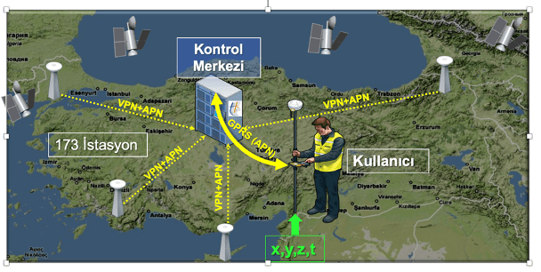 Birden fazla GNSS alıcısının eşzamanlı kullanımı ile göreceli bir yöntemle konum belirlendiğinden cm seviyesinde hassasiyet sağlar. Günümüzde GNSS teknolojisindeki gelişmeler, nokta konumlarının gerçek zamanlı olarak belirlenmesini sağlamıştır. İlk olarak cm seviyesinde gerçek zamanlı olarak nokta konumlarını belirleyen klasik RTK yöntemi geliştirilmiştir. Ancak bu yöntemde atmosfer, yörünge hatası ve sistemle ilgili etkileri önlemek için referans istasyonu ile kullanıcı arasındaki mesafe yasal olarak 5 Km. ile sınırlandırılmıştır. Bu nedenle, klasik RTK yöntemindeki sınırlamaların ortadan kaldırmak için, birden fazla sabit istasyon kurmak için yeni bir fikir önerildi. 1990’lı yıllardan bu yana, sürekli çalışan referans istasyonları (CORS), yüksek doğruluk gerektiren jeodezik ölçümler için kullanılmakta ve GNSS sistemlerine dayalı olarak cm seviyesinde gerçek zamanlı konum bilgisi sağlamaktadır. Bu düşüncenin hayata geçirilmesi ve edinilen deneyimler sonucunda sabit GNSS ağları (RTK ağı) ortaya çıkmıştır. Ağ RTK GNSS teknolojisi artık anlık konum verilerini yüksek doğrulukla elde etmek için yaygın olarak kullanılmaktadır. Türkiye’de, Mayıs 2009 itibariyle, dördü Kuzey Kıbrıs Türk Cumhuriyeti’nde bulunan TUSAGA-Aktif şebekesinde 173 istasyon bulunmaktadır. Bu sistem, tek bir referans istasyonuna bağımlılığı ortadan kaldırdı ve çok sayıda referans istasyonundan gelen verileri kullanarak belirli bir bölgenin atmosferik modellemesinin kullanılmasına izin vermektedir. Sistemin kontrol merkezi Tapu ve Kadastro Genel Müdürlüğünde bulunmaktadır ve 18 bin civarı kullanıcısı vardır. TUSAGA-Aktif’e abonelik ve diğer bilgileri için lütfen https://www.tusaga-aktif.gov.tr adresini ziyaret ediniz.
