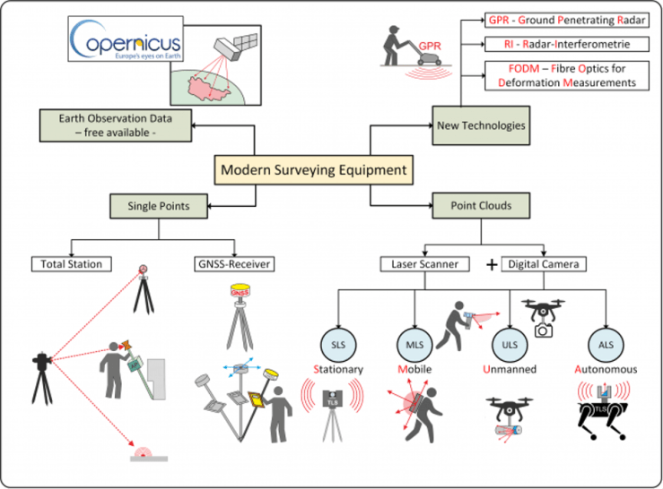 Yeni teknolojilerin kullanımı: Son zamanlarda yere nüfuz eden radar (GPR), radar interferometrisi (RI) ve deformasyon ölçümleri için fiber optik (FODM) dahil olmak üzere yeni ölçüm teknolojileri ortaya çıkmıştır. Sayılan son iki teknoloji, ardışık ölçümler yoluyla nesnelerdeki küçük değişikliklerin (deformasyon analizi) tespitine odaklanır.