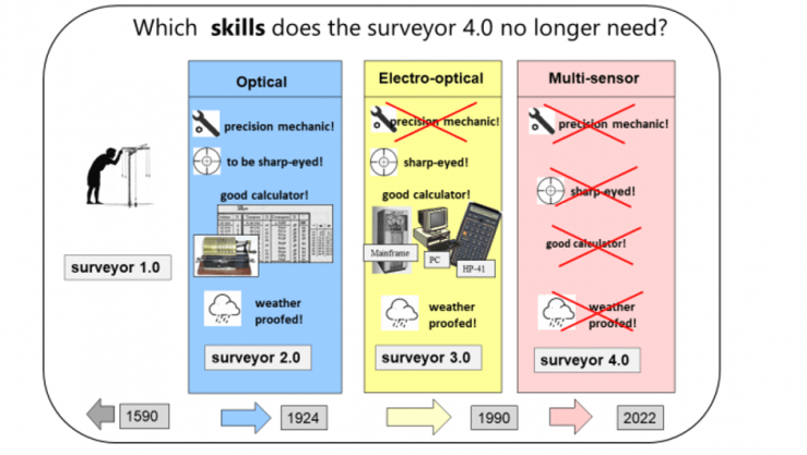 Bugünün haritacılarının hangi becerilere ihtiyaç duyduğu sorusuna cevap bulmak için, hangi becerilerin modası geçmiş olduğunu inceleyerek başlamak yararlıdır. En eski haritacılarının nasıl çalıştığına dair çok az ayrıntı olmasına rağmen, Haritacı 2.0 ve 3.0’ın keskin gözlü, hava koşullarına dayanıklı ve elle yapılan hesaplamalarda deneyimli olduğunu biliyoruz. Hesaplama araçları zamanla değişti, ancak birçok manuel çalışma hala kaldı. Haritacı 4.0 için artık çok farklı bir durum var, çünkü ölçümler tamamen otomatik hale geldi (örneğin otomatik hedef bulma, izleme ve lazer tarama ile) ve hesaplamaları yapmak için çok sayıda yazılım mevcuttur. Bununla birlikte, sahadaki çalışma süresi on yıllar öncesine göre çok daha kısa hale geldi ve otonom sistemler söz konusu olduğunda genellikle neredeyse sıfıra indirildi.
