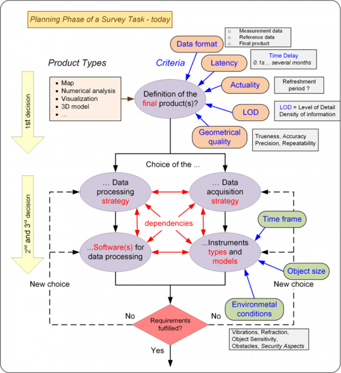 Geçmişte, haritacılıkta yöntem belirlemek nispeten basitti. Sadece birkaç ölçüm yöntemi vardı ve mevcut durumun aksine, her görev için belirli bir cihaz olduğu için farklı cihaz türleri arasında seçim yapmaya gerek yoktu. Genel olarak, tüm veri toplama süreci yönetmelikler tarafından yönlendirilir ve kontrol edilirdi ve ölçüm süreçleri ile ilgili bireysel kararlara yer yoktu. Ölçümler ile sadece noktaların yatay konumları veya yükseklikleri belirlenirdi ve nihai sonuçlar ya önceden belirlenmiş sabit ölçekli bir harita ya da sayısal bir analizdi (Şekil 9).