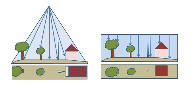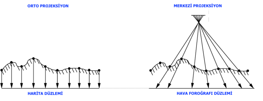 Aşağıdaki şekilde orto projeksiyon ile merkezi projeksiyon farkını görebilirsiniz.