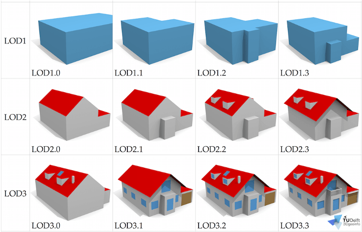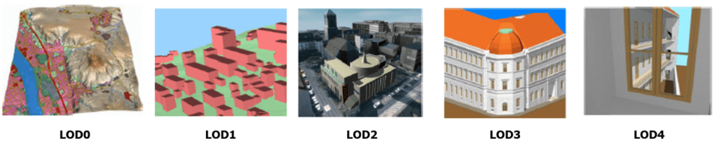 CityGML OGC standardı; basit bir 2.5D bina oturum çizgisinden (LOD0), odalar ve mobilyalar gibi iç mekan özelliklerini içeren(LOD4) ayrıntılı bir mimari modele kadar beş LOD’yi tanımlar.