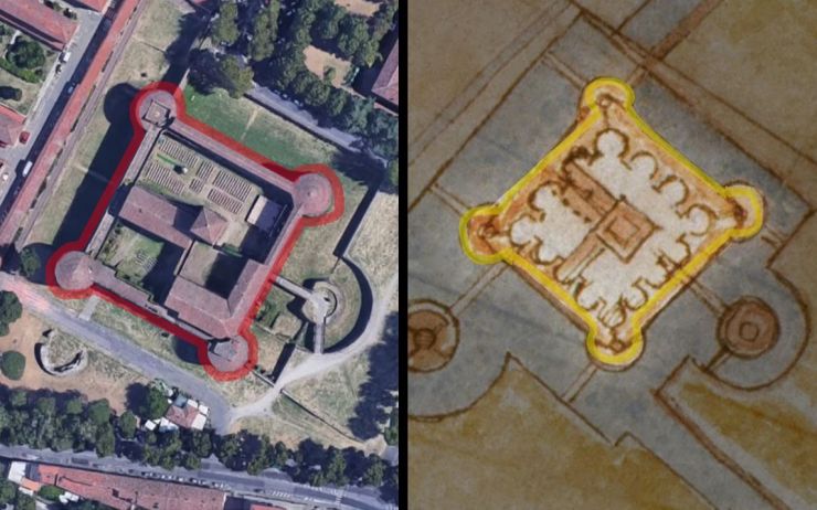 Leonardo, bir kasabanın kutupsal koordinatlar kullanılarak haritalanabileceğini öne süren Floransalı mühendisLeon Battista Alberti tarafından geliştirilen bir haritalama tekniğini uyguladı. Leonardo Alberti’nin tekniğiniözellikler nesneler arasındaki mesafeleri, oranları ve ilişkileri daha doğru yakalamak için kullandı.